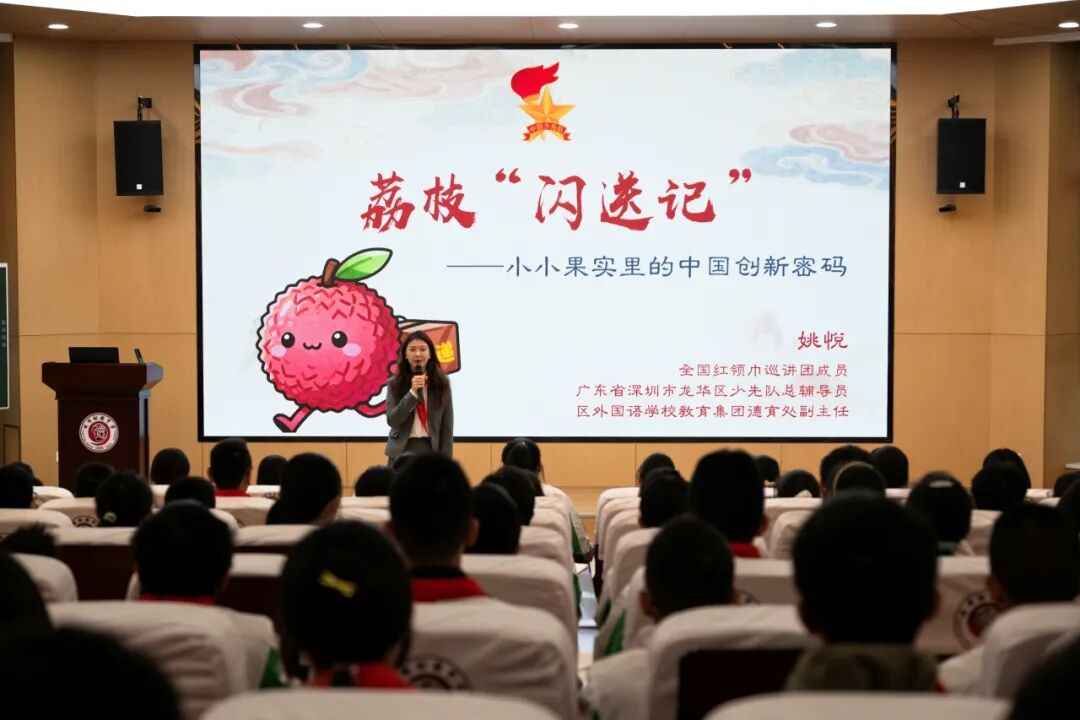 全国红领巾巡讲团成员、广东省深圳市龙华区少先队总辅导员、区外国语学校教育集团德育处副主任 姚悦,分享《荔枝“闪送”记——小小果实里的中国创新密码》
