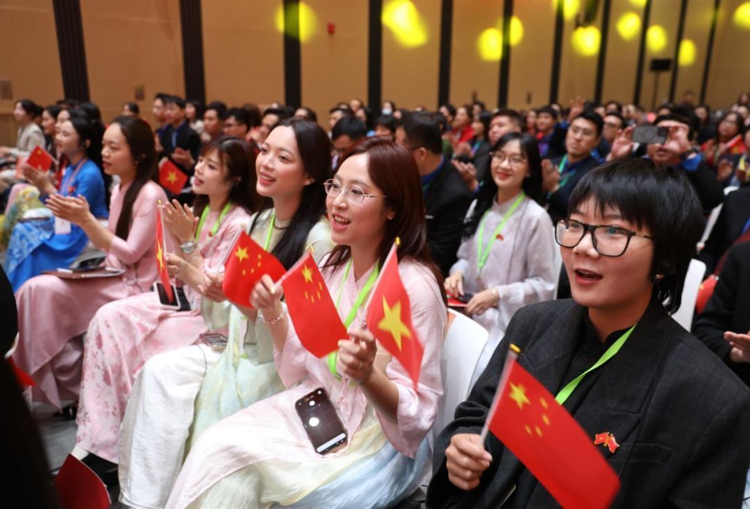 4月14日,北京,“传承红色基 因”中越青年演讲会在中央团校举行,参会青年挥舞中越两国国旗。 中青报·中青网记者 陈剑/摄